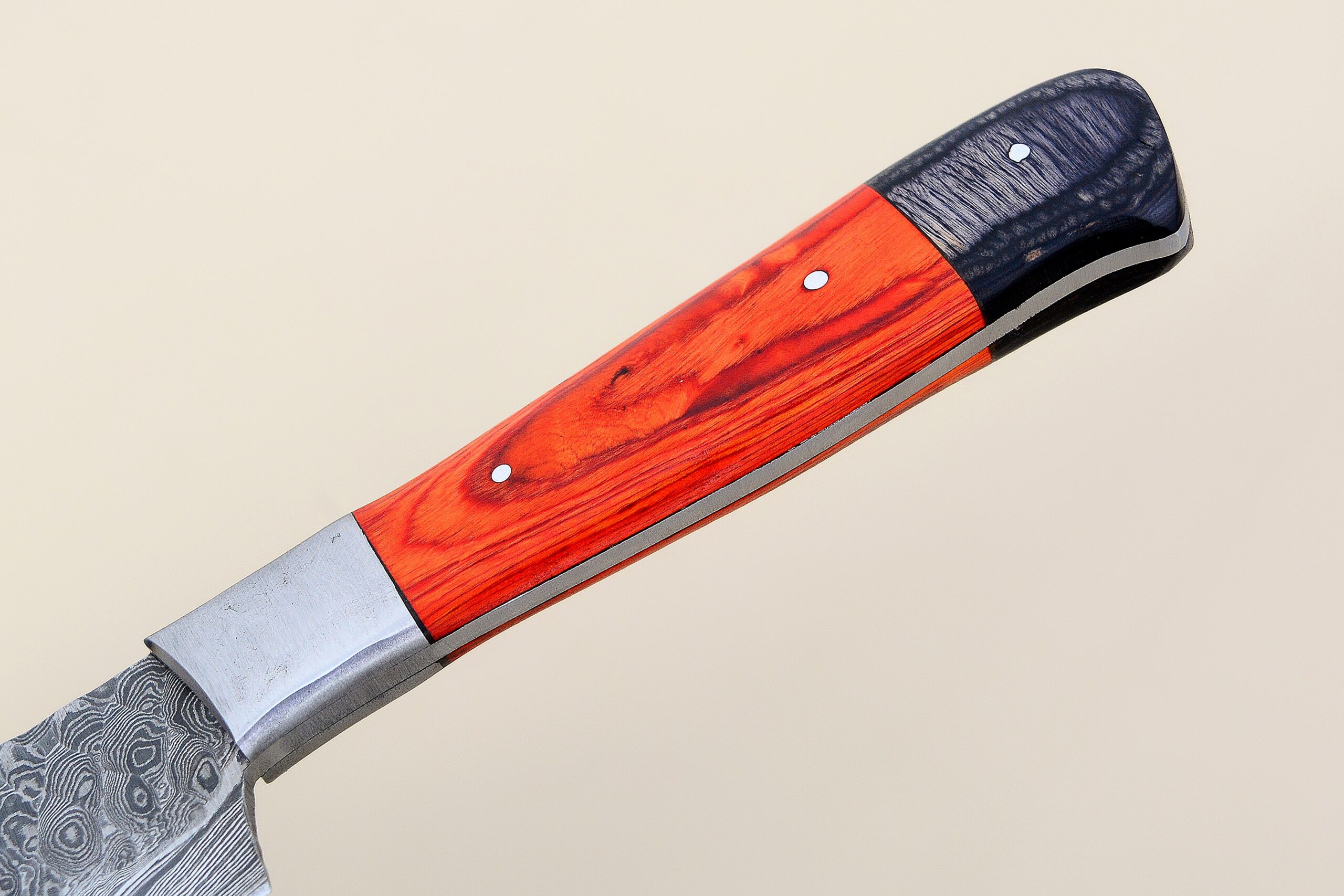 Full tang premium quality handmade chef knife is made of Damascus steel with wooden handle. Premium quality blade is rust free for many years. Wooden handle pinned on Damascus steel. Design on blade is punched with hammer. Its high quality material is rust free and very sharp edge. Damascus steel is well know for durability and keeps it edge sharp for long time.