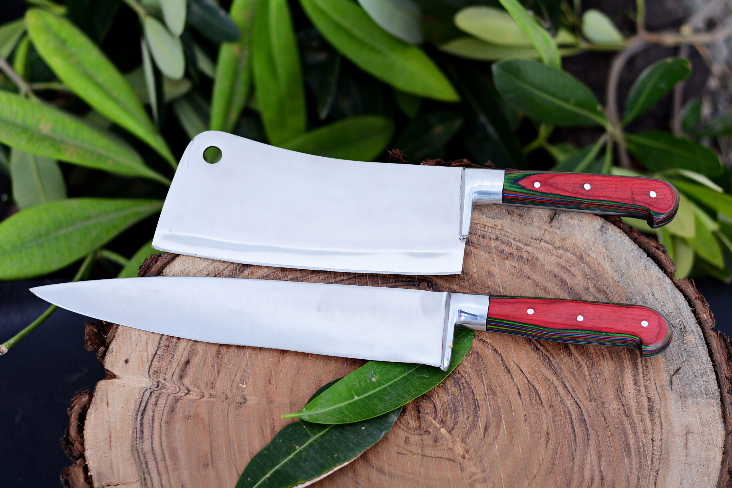 Premium quality handmade chef knife and meat cleaver set is made of stainless steel with wooden handle. Premium quality material is rust free and holds it sharpness for long time. Its easy to sharpen at home, easy to wash and easy to care. Its general purpose chef set for home and commercial use.