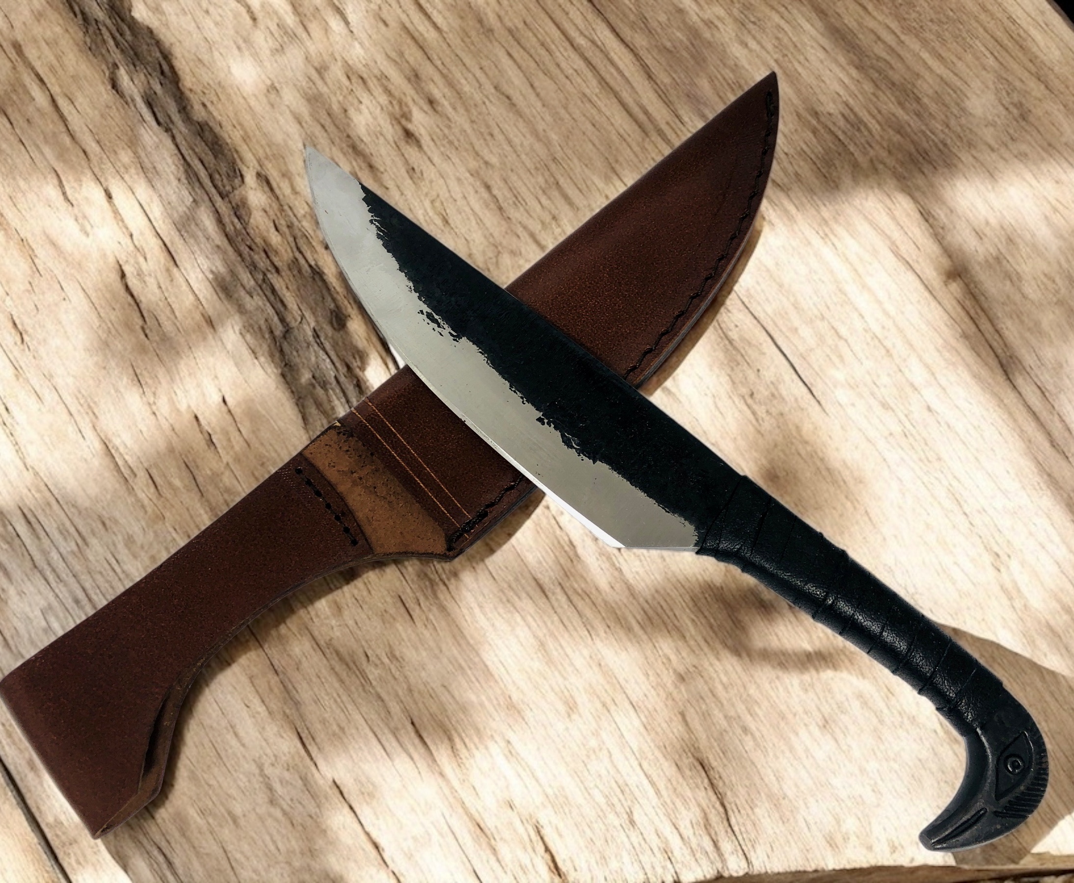 Grip: – Railroad Iron strapped with leather for best grip